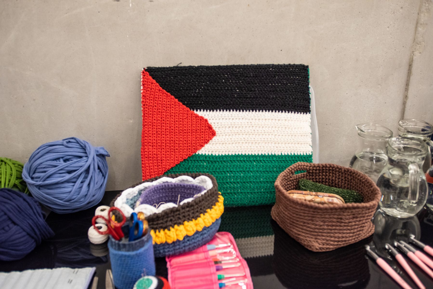 Join us at the workshop where you can crochet items related to Palestine with the members of No-Border Craft women collective.